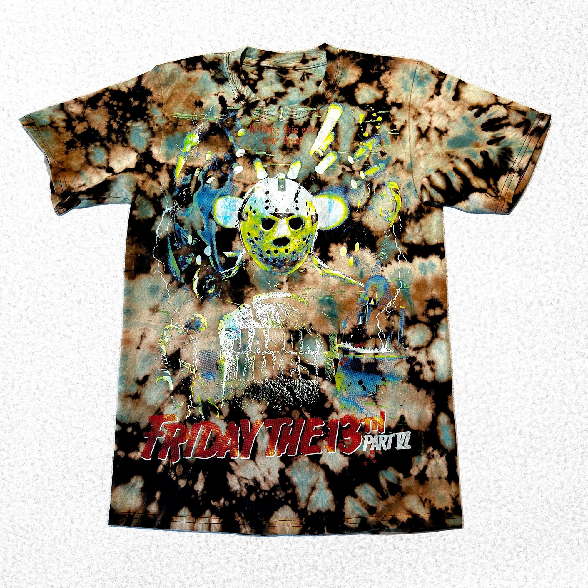This rare tee brings Mr. Voorhees to life with a vivid, distressed graphic exploding in neon highlights. Set against a brown, black, and teal tie-dye wash, the chaotic design captures the horror and cult energy of the slasher sequel, making it a true collectible for fans of the franchise.
