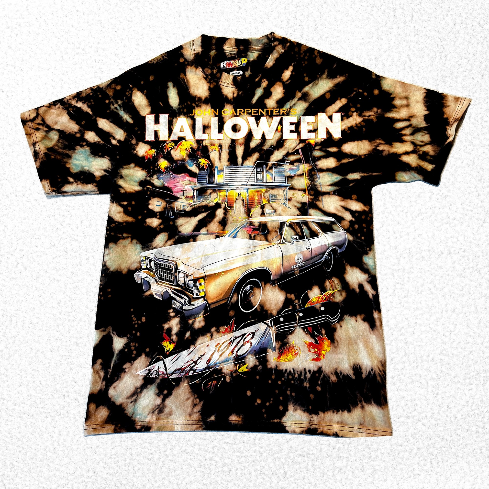 The Halloween 1978 Spiral Tee reimagines John Carpenter’s cult classic with a vivid print of the Myers house, vintage station wagon, and blood-stained knife marked 1978. Laid over a brown-and-black spiral tie-dye wash, this shirt channels retro horror nostalgia with a gritty, one-of-a-kind look.