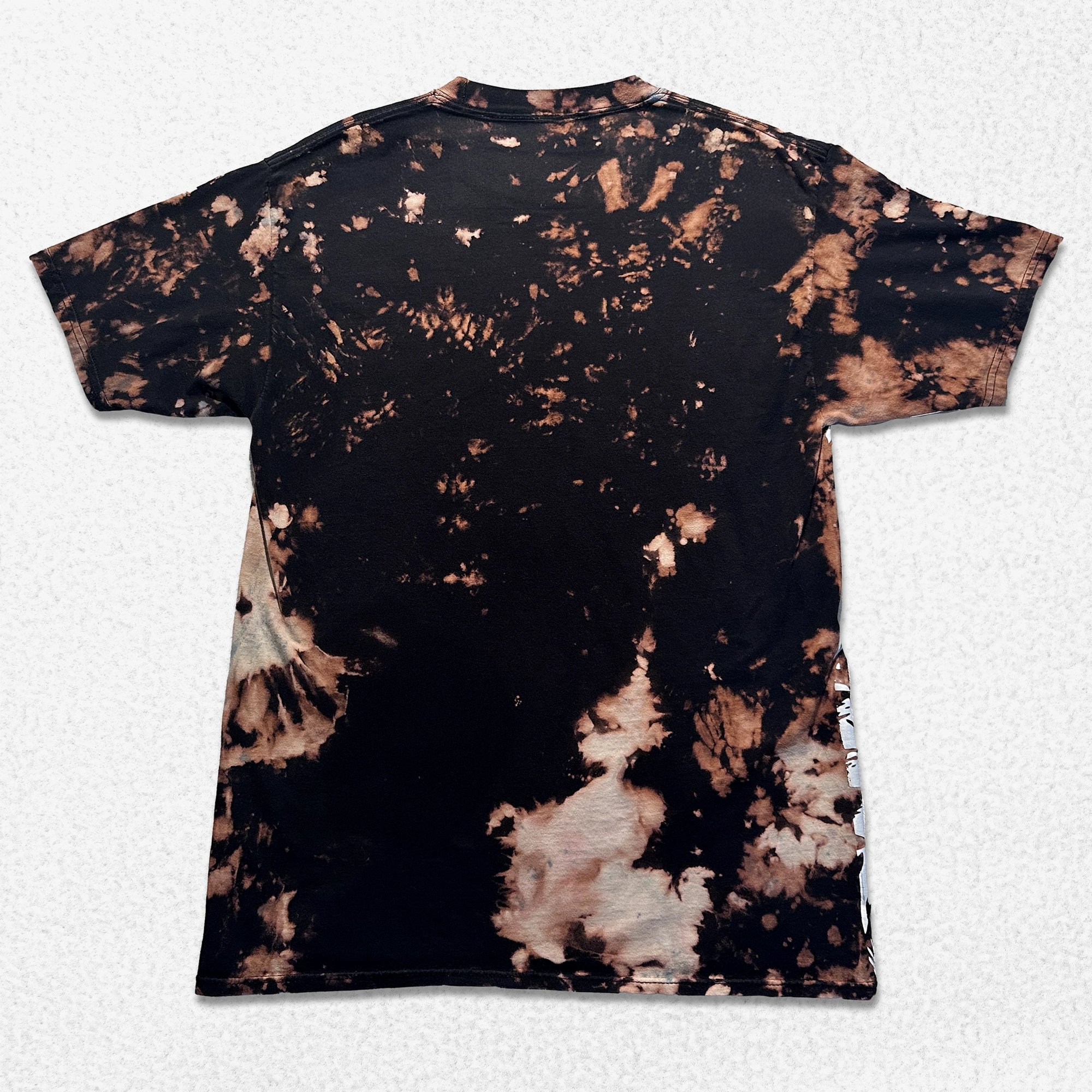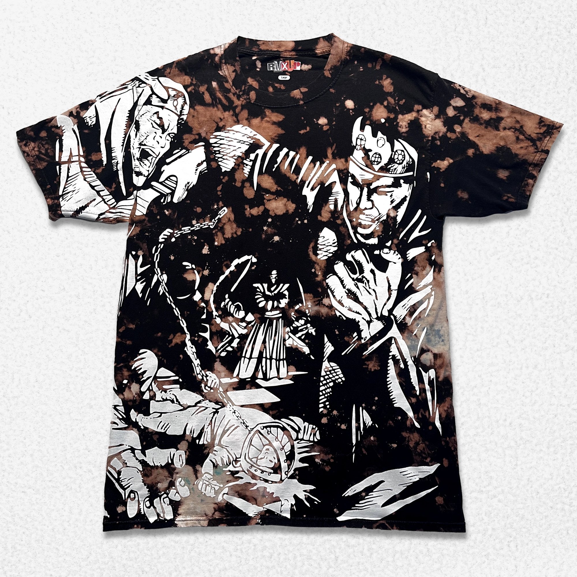 This one-of-one tee features an illustrated scene from Liquid Swords—chessboard carnage, Shaolin blades, and pure Wu energy. The brown/black reverse-bleach spiral hits like dust kicked up in a midnight swordfight.