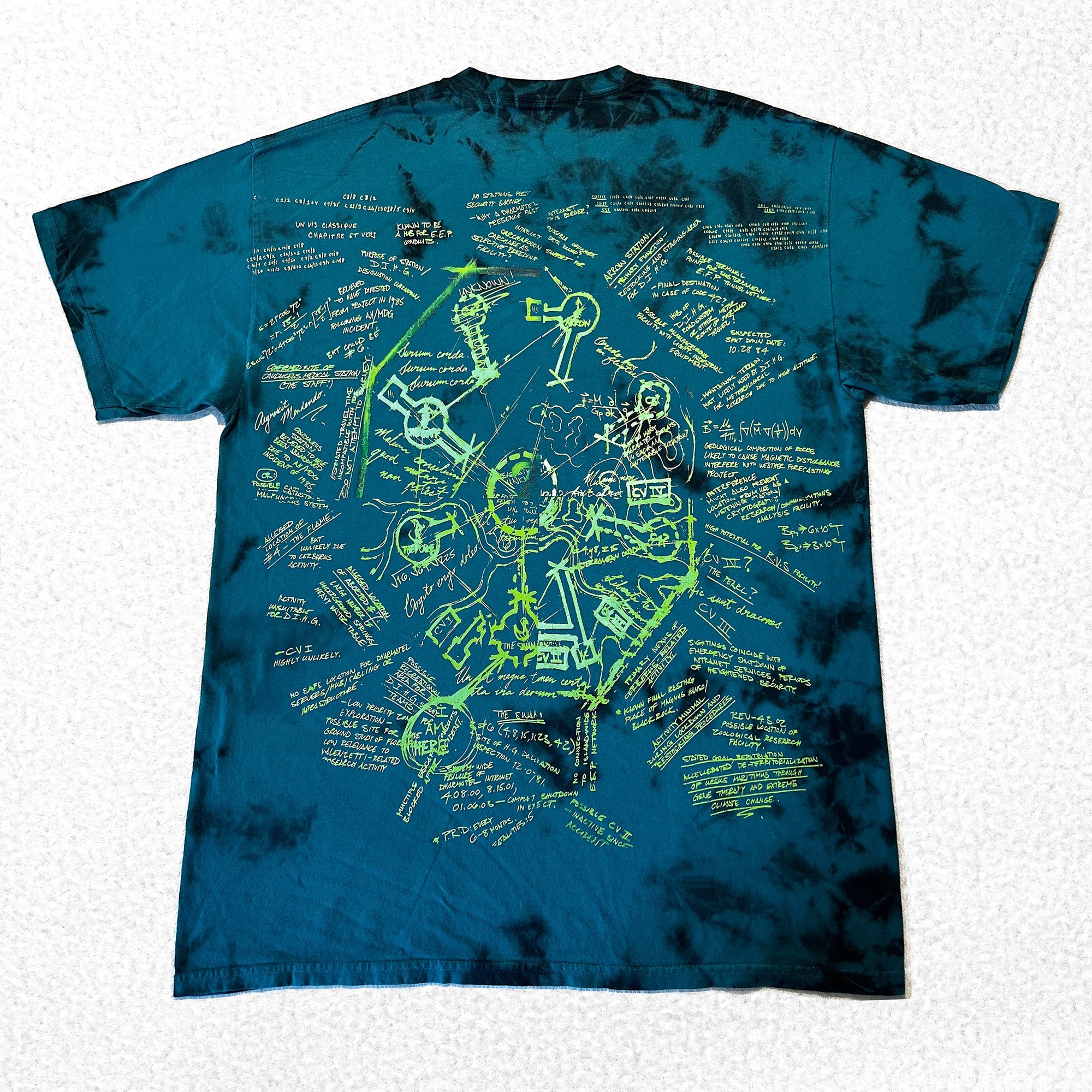 The LOST Blueprint Tee blends bold streetwear aesthetics with cryptic design. The front keeps it minimal with a clean LOST logo and overgrown graphic accent, while the back explodes into a chaotic map of handwritten notes, sketches, and symbols printed in neon green. The custom tie-dye wash in teal and black makes each piece one-of-a-kind.