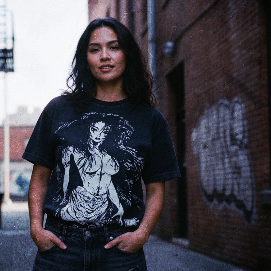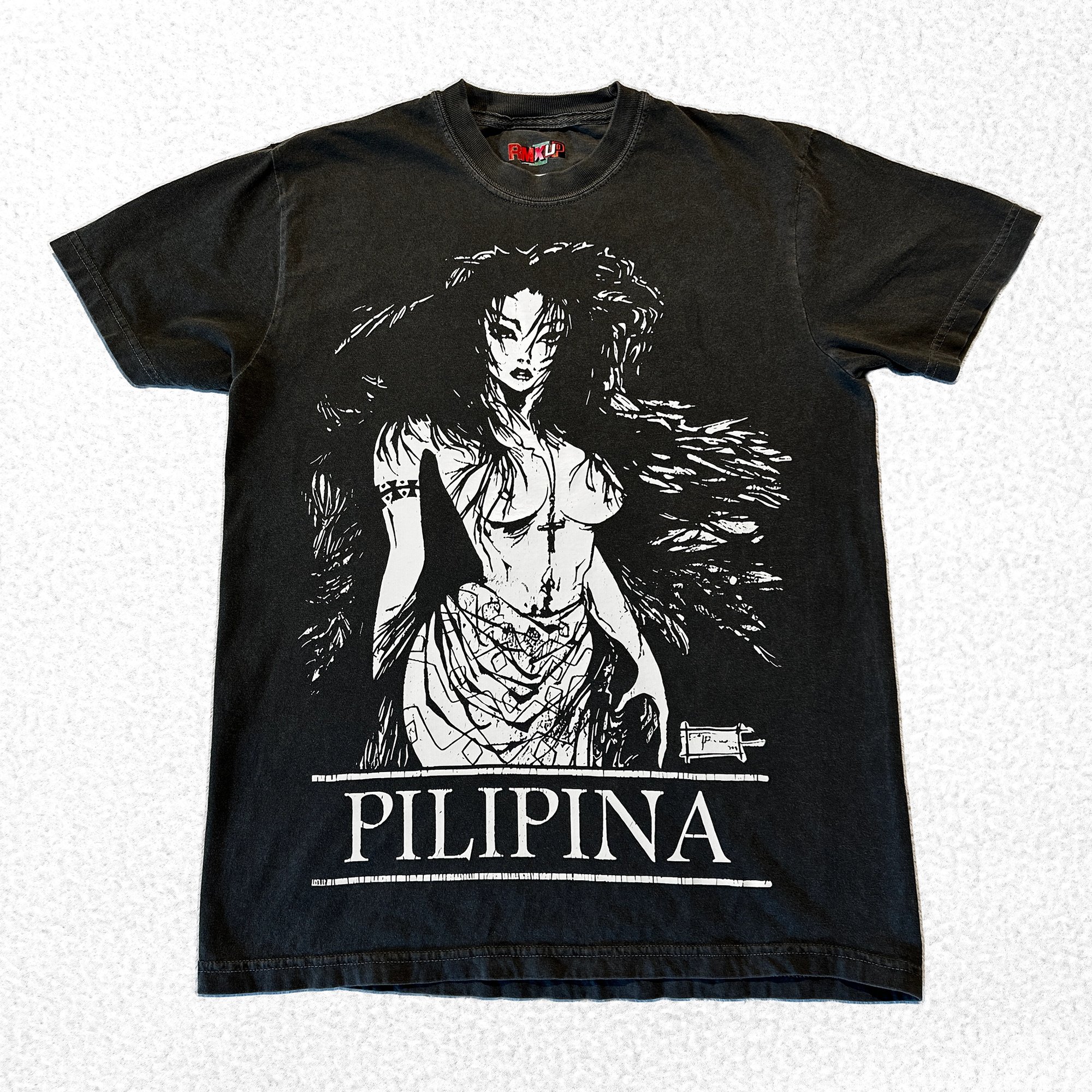 The rare tee commands attention with a stark black-and-white illustration of a fierce female figure, framed by flowing hair and bold line work. Anchored by the word Pilipina across the bottom, this design celebrates strength, resilience, and identity with raw, uncompromising style.