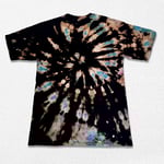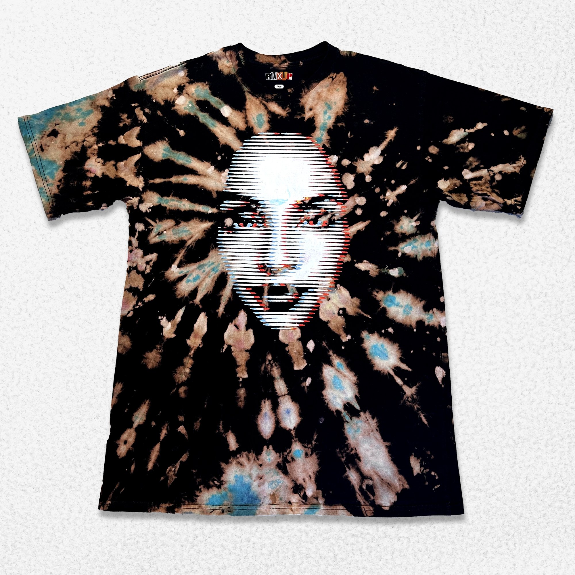 This one-of-one tee features a striking line-art portrait of Sade, centered in a hypnotic spiral of reverse bleach and cool blue highlights. A tribute to timeless smoothness, soul, and style—remixed into a wearable vinyl cover for your chest.